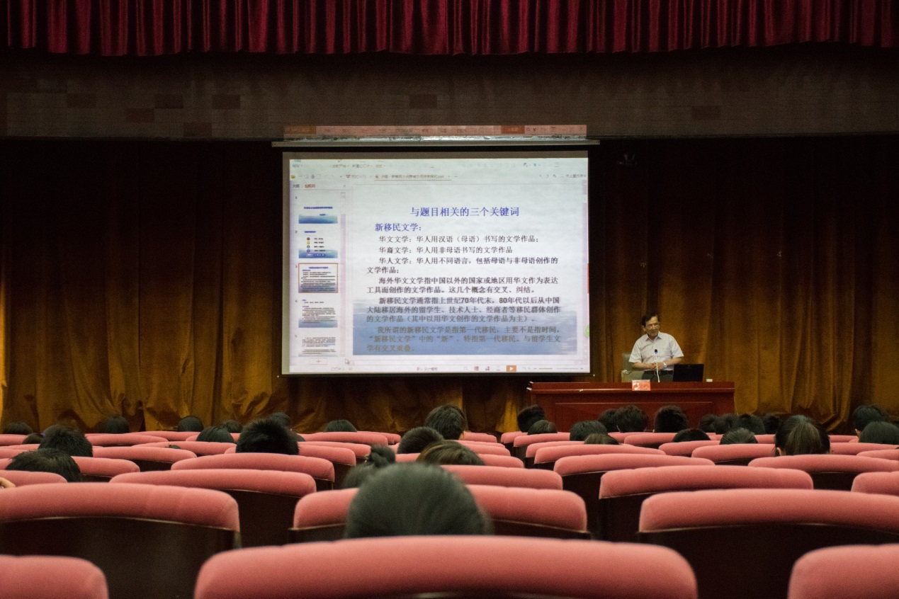 讲座以“新移民小说的跨域空间诗学探究” 为主题带领广大学子于新移民小说中“原乡”与“异乡”时空错落的地域空间位置特殊性间,管窥新移民小说的独特诗学魅力。讲座中,江教授列举了许多经典的新移民文学作品,如《金山》、《北京人在纽约》、《扶桑》等著名文学作品,深入浅出的讲述了新移民文学领域的发展过程,为我们打开了一个新的文学领域的窗口。