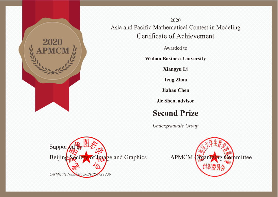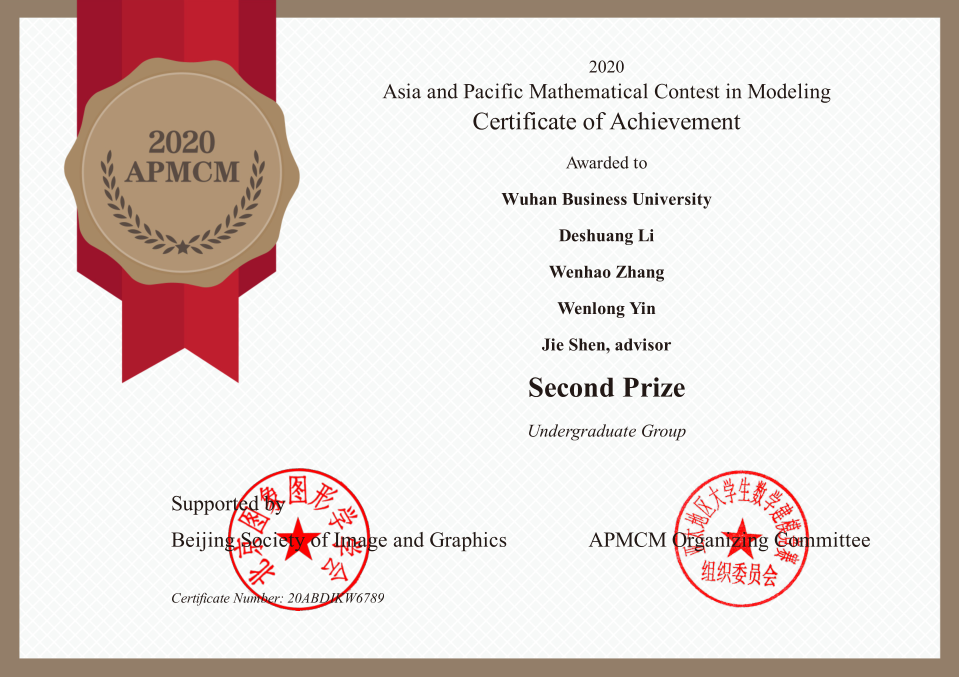 近日,2020-2021亚太杯数学建模竞赛结果揭晓,伟德victor1946官网登录组织的两支员工团队分别获得亚太地区(APMCM)数学建模比赛二等奖。这是继2020年获得全国数学建模比赛湖北省赛区一等奖在获奖级别和获奖数量均创下该类型比赛历年最好纪录后,武汉商公司首次在参加亚太地区(APMCM)数学建模比赛中取得的较好成绩。