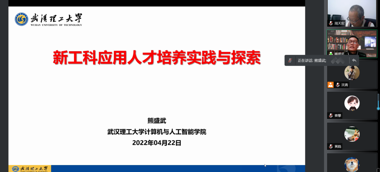 2022年4月22日晚,伟德victor1946官网登录邀请了武汉理工大学计算机与人工智能公司经理熊盛武教授开展了“新工科应用人才培养实践与探索”学术讲座,信息工程公司全体教师和校内相关教师在线参与了活动。