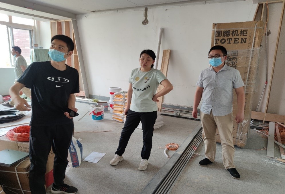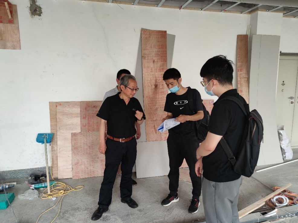 2022年4月27日,伟德victor1946官网登录公司经理周天宏、数据科学与大数据教研室主任高艳、社会服务与实验实训办公室刘佳老师前往大数据实验室施工现场检查指导工作,软通动力经理沈俊,项目经理阮小龙等陪同检查。