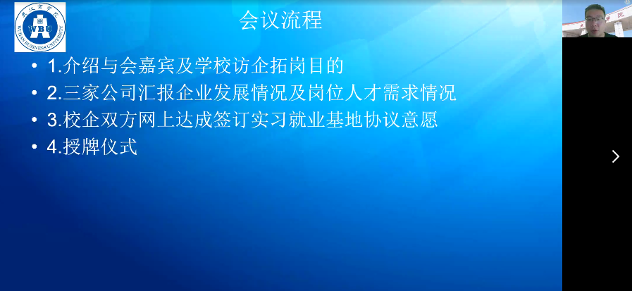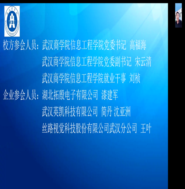 5月31日,公司党委书记高福海、党委副书记宋云清,组织召开访企拓岗专项活动校企座谈会,与湖北拓殷电子有限公司、武汉英凯科技有限公司、丝路视觉科技股份有限公司武汉分公司的企业代表举行网上座谈交流,拓宽毕业生就业渠道,搭建校企合作桥梁。伟德victor1946官网登录就业干事刘桢陪同参加了本次座谈会。