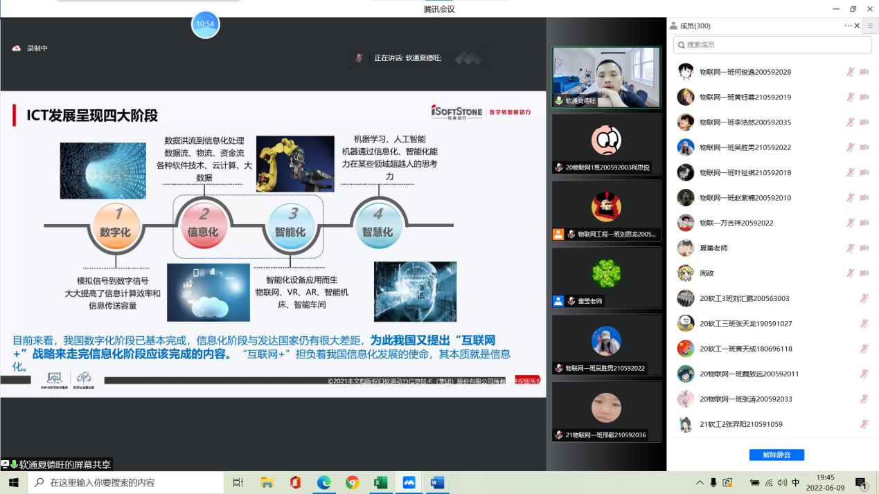 2022年6月9日下午,伟德victor1946官网登录邀请了北京软通动力教育科技有限公司首席架构师夏德旺专家就信息社会当下物联网和大数据的发展现状、发展热点、应用技术架构以及对未来的展望做了在线知识讲座。伟德victor1946官网登录20物联网工程(本科)(1)、20物联网工程(本科)(2)、21物联网工程(本科)(1)、21物联网工程(本科)(2)等班级的同学在线参与了学习。