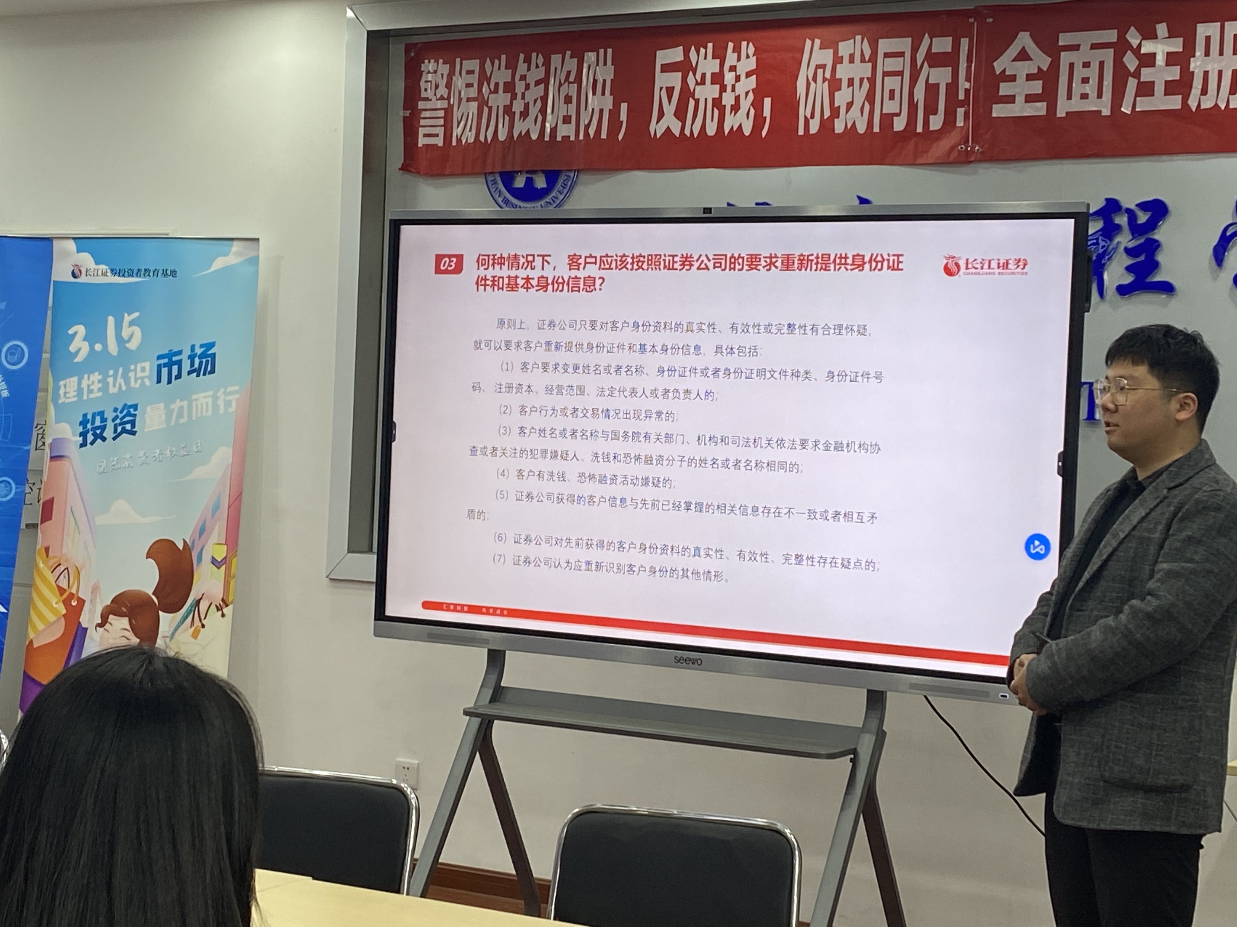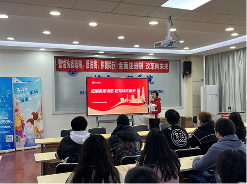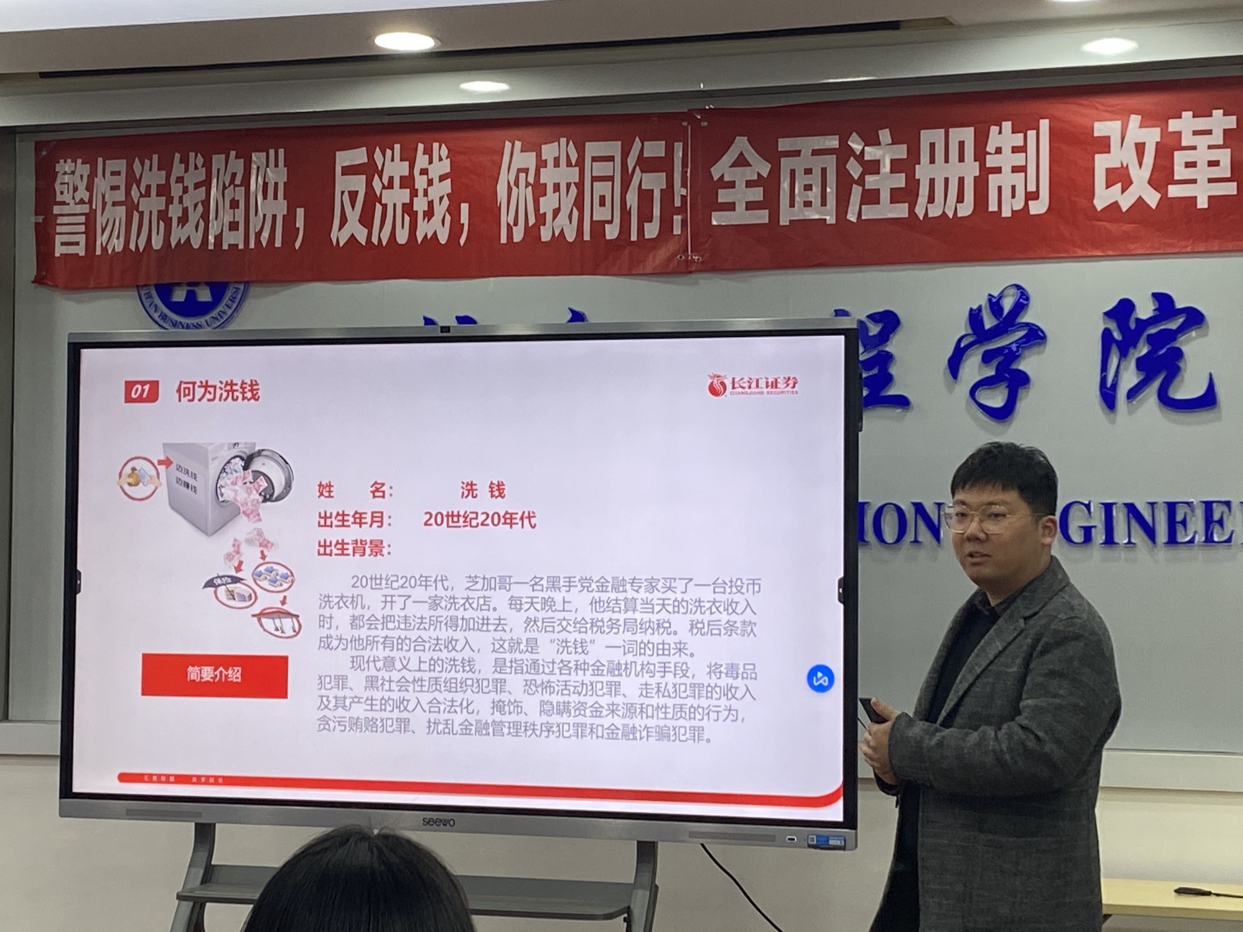 长江证券讲师给师生们介绍了反洗钱,何为洗钱,常见的洗钱方式,金融业反洗钱的意义,以及反洗钱知识问答,PPT中分享了大量丰富的案例,因为和平时生活有联系,同学们听得饶有兴趣。