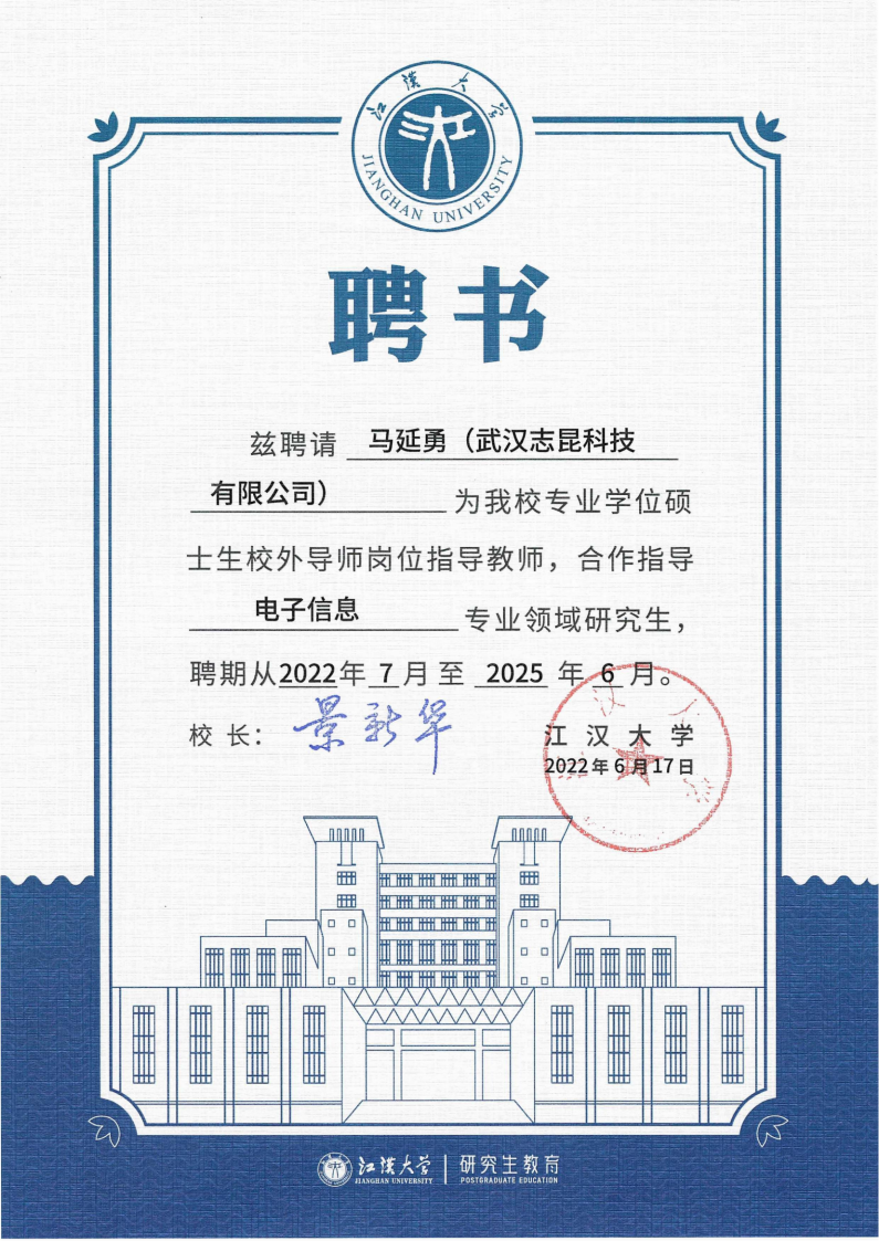 3月10日上午,江汉大学在师生活动中心301报告厅举行了首批博士生导师暨2022年度新增硕士生导师聘任仪式。我们公司的产业教授马延勇受聘为江汉大学人工智能公司专业学位硕士研究生校导师。江汉大学副董事长李卫东主持了聘任仪式,研究生处处长刘继延则宣读了博士生导师、硕士生导师聘任文件。