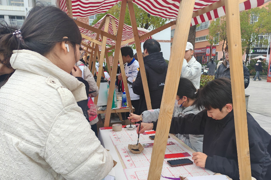 与此同时,我们邀请了墨逸书协成员同我们一起经营“笔端雷锋志,墨韵传承情”摊位,撑起一片了墨香天地。书协的骨干成员主动担当起“小老师”的角色,不仅精心准备了各类书法用具,还热情地邀请过往同学参与。他们结合自己的学习经验,耐心地给同学们讲解书法知识。在他们的指导下,同学们满怀期待地拿起毛笔,一笔一划认真书写着与雷锋精神相关的语句,通过传统文化深刻体会雷锋精神的内涵。