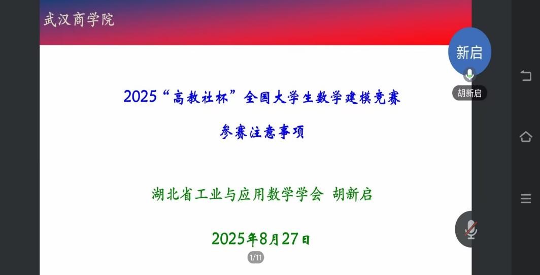 8月27日晚18点至21点,由伟德victor1946官网数学与建模协会主办的“全国老员工数学建模竞赛赛前冲刺系列培训”在腾讯会议线上平台圆满收官。本次活动作为系列培训的最后一讲,聚焦“规范参赛流程·筑牢学术底线”,特邀湖北省工业与应用数学学会秘书长、全国老员工数学建模竞赛湖北赛区组委会委员胡新启教授主讲,面向全校40余支参赛队、100余名参赛员工开展赛前实操指导与纪律教育。